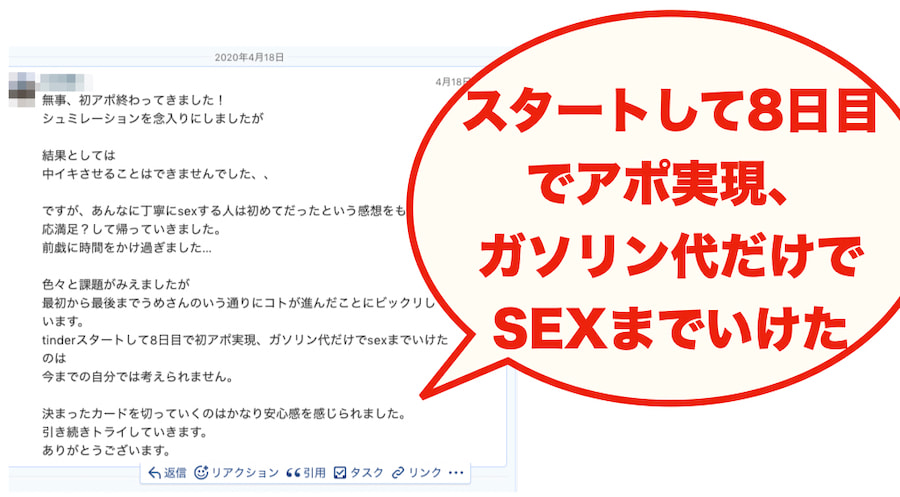 開発したノウハウを使い、マッチングアプリで顔出し無し、月に13人の女性とホテルインする。 更にテンプレートでやりとりするだけで、再現できるレベルに落とし込むことに成功。