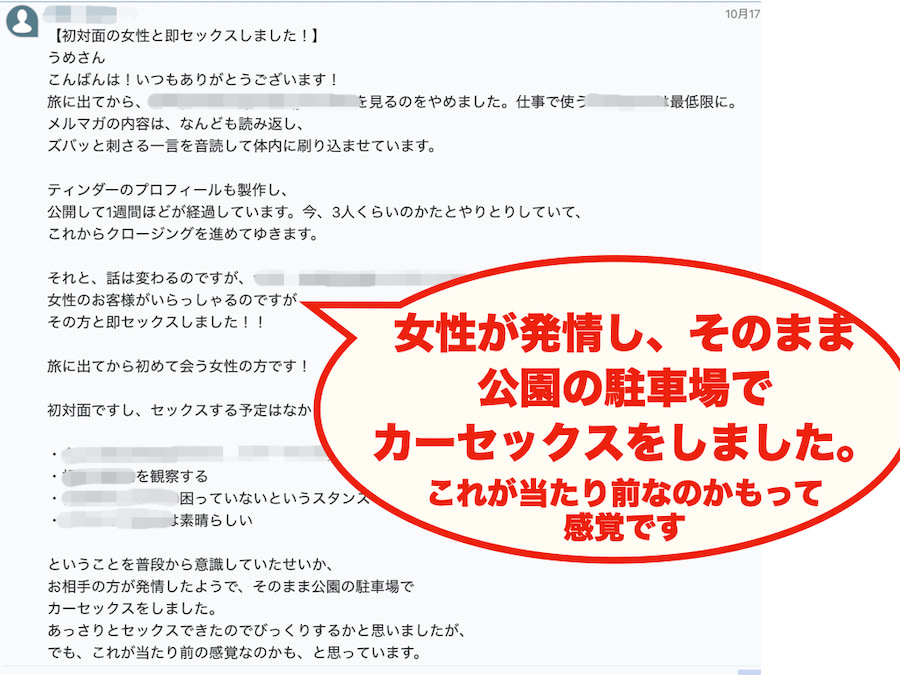 それから4年以上たったある日、NLPや催眠療法の知識や、渋谷で100人切りをした経験をバックグラウンドに、知り合いのマッチングアプリの相談に乗って即結果を出させた事をきっかけに、文章のみで女性に価値を感じさせ、魅了する技術の開発、指導を始める。